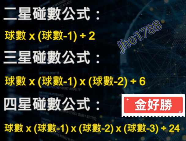 四星為四個號碼為一組,四星連碰算法為:球數X(球數-1)X(球數-2)X(球數-3)÷24。